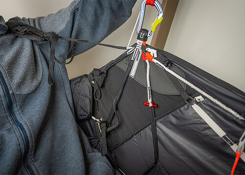Im Cockpit finden deine Instrumente Platz, während diverse Staufächer (Rückenfach, unter dem Sitz, "Kangaroo Pocket") genug Volumen für Vol-Biv-Ausrüstung bieten. Die 3-stufige Beschleunigeranlage läuft reibungsarm durch Low-Friction-Ringe, was lange Talquerungen im Gas kräfteschonend macht.